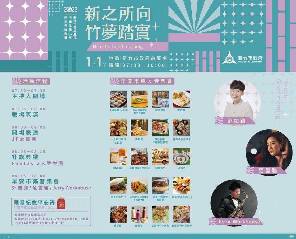 為迎接2023年的開始,新竹市政府1月1日上午7點30分,將於市府前廣場舉辦升旗典禮,當天國歌領唱安排Fantasia人聲樂團,跳脫以往制式化的升旗典禮,以新穎的人聲方式演唱讓本次活動帶給市民朋友耳目一新感受,另有晶晶兒童合唱團、社區照顧關懷據點VS MIKI 兒童街舞的暖場表演,JF太鼓及鄭如鈞、范書雅、Jerry Workhouse三組歌手的精彩獻唱,周 邊也集結20攤多樣、豐富的早安市集,歡迎市民朋友一起共度2023年「新之所向 竹夢踏實」美好的第一天。