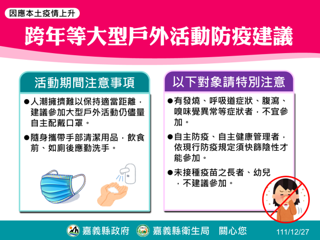 南部新聞嘉義縣嘉義縣今公布428人確診 提醒元旦跨年應配合防疫措施 南部新聞嘉義縣 嘉義縣今公布428人確診 提醒元旦跨年應配合防疫措施 編輯 林 欣欣 2022-12-27 嘉義縣今公布428人確診(境外2人),其中有症狀25人,無症狀403人。年齡介於5個月-101歲,12歲以下52人,65歲以上60人。累計全縣12歲以下染疫幼童17,399人,65歲以上19,634人,目前輕症居家照護1,357人。 元旦即將來臨,縣長翁章梁提醒民眾,參加跨年各項大型戶外活動,仍應儘量配戴口罩及隨身攜帶手部清潔用品,自主防疫及自主健康管理者需快篩陰性才能參加,尤其未接種疫苗的長者及幼兒不建議參加,另請儘速完成疫苗接種,以共同維護社區健康,相關接種服務可上嘉義縣衛生局網站查詢。 延伸閱讀 商情 新北室內裝修推薦|蘆洲裝修設計施工一條龍服務,我家裝潢「室內圖面設計費用」有必要嗎? 商情 新北台北室內裝修公司推薦,蘆洲漢一室內裝修裝潢、空間規劃設計一次看 商情 高雄左營二手精品新據點:收購及寄賣一整套的精品服務 商情 蟑螂螞蟻總出沒?媽媽們瘋傳這瓶「天然防蟲神器」好用到想囤貨!