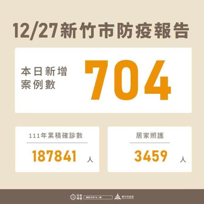 新竹市今(27)日新增704例確診個案,今(111)年以來累積187,841例,居家照護者為3,459人。