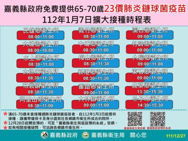 嘉義縣繼樂齡假牙補助,再增一長者照護政策,自購17600劑23價肺炎鏈球菌疫苗,提供設籍嘉縣65至70歲民眾免費接種,28日起開放網路預約,112年1月3日攜帶身份證及健保卡至衛生所或合約院所共31家接種。