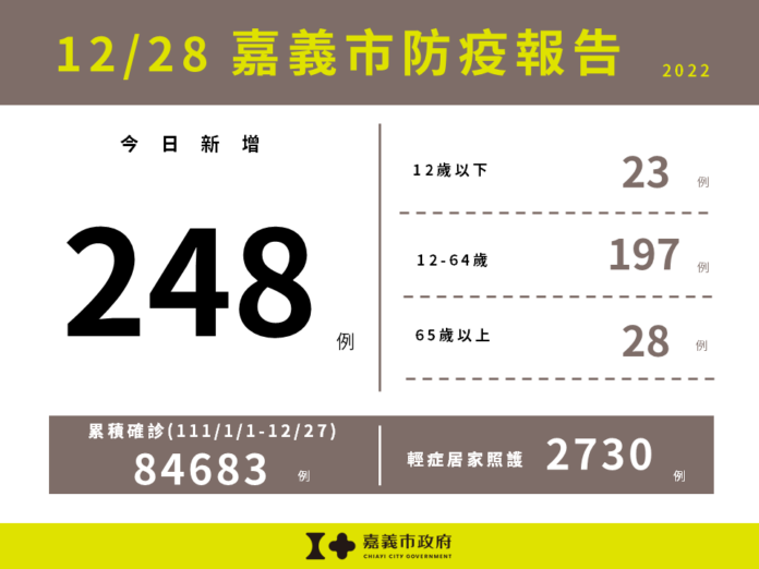 中央流行疫情指揮中心今(12/28)日公布嘉義市新增248例確診個案,包含12歲以下23例,12-64歲197例,65歲以上28例。嘉義市目前輕症居家照護人數2,730人。111/1/1截至111/12/27嘉義市累計確診嚴重特殊傳染性肺炎本土病例數為84,683人。 衛生局提醒,請大家儘速接種疫苗,並持續落實勤洗手、咳嗽禮節及佩戴口罩等防疫措施,避免出入人多擁擠的場所及高感染傳播風險場域,如出現疑似症狀,儘速快篩就醫和遵從醫囑及早服藥,降低重症及死亡風險;並請養成規律運動、均衡飲食、充足睡眠、壓力調適、不吸菸等健康習慣,提升免疫力,守護自己與家人的健康。