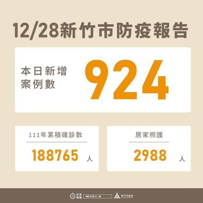 新竹市今(28)日新增924例確診個案,今(111)年以來累積188,765例,居家照護者為2,988人。