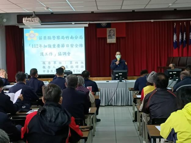 苗栗縣警察局竹南分局於111年12月26日14時30分在分局4樓禮堂召開112年加強重要節日安全維護協調會,邀請各相關單位參加,宣導工作重點及相關犯罪預防知識,並進行討論,與會人員反映熱烈,期投入警察、義警、義交、民防、守望相助隊、志工等協勤民力維護春節治安與交通讓民眾過好年。