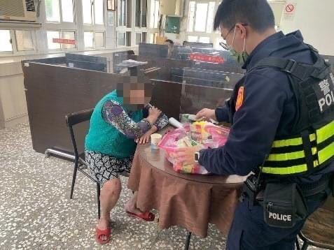 員警到場後,在該處涵洞中發現該名老婦,眼神茫然、喃喃自語,員警趕緊上前關心詢問,惟老婦無法回答員警任何問題,當時天雨,又濕又冷,老婦卻穿著短褲及拖鞋,員警深怕老婦會因此生病,便先行以巡邏車將老婦載返分駐所休息,並提供溫水及點心給老婦充飢止渴、暖和身體,於後在員警多方查證後,總算得知老婦住在苗栗市,便趕緊聯繫老婦家人報平安,並由老婦家人至分駐所將老婦接回家。