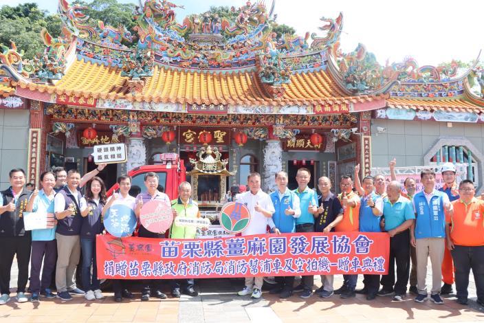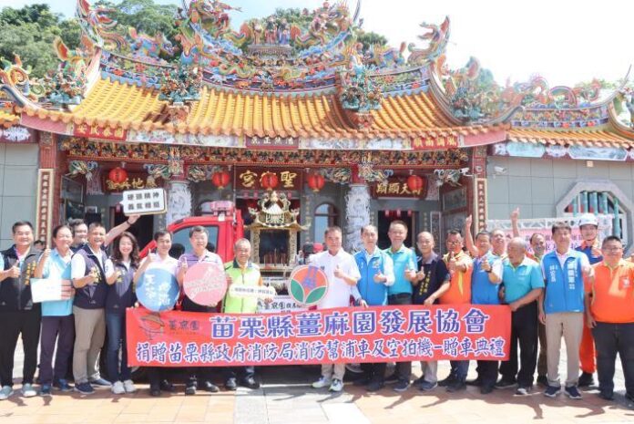 苗栗縣政府消防局20日上午於大湖鄉聖衡宮舉辦「薑麻園社區發展協會捐贈消防幫浦車典禮」,縣長鍾東錦前來感謝薑麻園協會長期推動農村再造及青年返鄉,如今更以實際行動回饋地方,展現民間力量與政府攜手守護鄉親生命財產安全的決心。鍾東錦表示,今天的捐贈不僅充實本縣消防戰力,更象徵公私協力、共築安全幸福家園的苗栗精神。