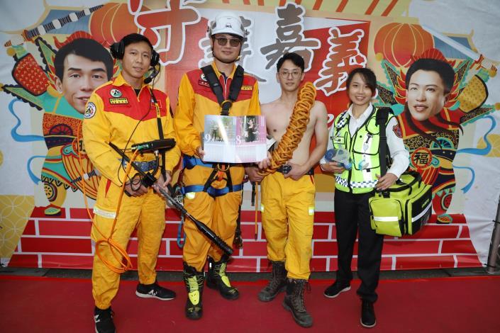 現場由消防人員手持各式裝備,包括救災儀器、餘震偵測儀、氧氣球等走秀登場,向眾人展現平時工作狀況,布袋分隊消防員李旺在寒冷的年末脫下上衣秀出健美身材,他同時也是農民曆6月份的內頁人物,非常有看頭。