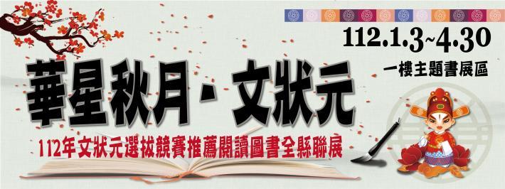 「華星秋月.文狀元」苗栗縣112年度文狀元選拔競賽推薦閱讀圖書全縣聯展登場了!苗栗縣立圖書館、各鄉鎮市立圖書館、各國中小圖書館(室)及社區共讀站等(含國立、私立高中附設國中部),將同步於112年1月3日至4月30日,展出國小10本、國中8本之文狀元選拔競賽推薦閱讀書籍,供予師生與鄉親閱覽。
