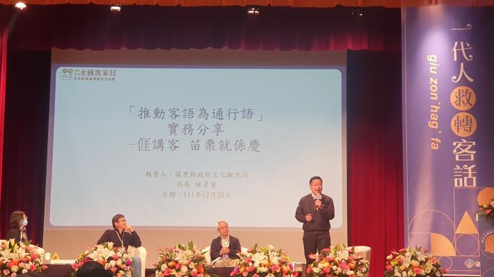 客家委員會今年起將12月28日「還我母語運動日」訂定為全國客家日, 28日特別在台北集思交通部會議中心舉辦「全國客家日-客家政策論壇暨紀念活動」,苗栗縣政府文化觀光局長林彥甫受邀分享苗栗縣連續4年獲得評核優等的經驗,讓更多人看到苗栗為傳承客語的堅持和努力,並期待更多人加入講客行列,加速客家語言文化邁入主流化。