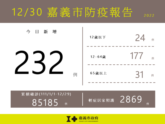 中央流行疫情指揮中心今(12/30)日公布嘉義市新增232例確診個案,包含12歲以下24例,12-64歲177例,65歲以上31例。嘉義市目前輕症居家照護人數2,869人。111/1/1截至111/12/29嘉義市累計確診嚴重特殊傳染性肺炎本土病例數為85,185人。 本土疫情升溫,衛生局提醒,無論是否曾確診,符合間隔時間者均建議追加接種BA.5次世代疫苗,請大家儘速接種疫苗;另參加大型活動建議全程戴口罩,長者、幼兒儘量避免參加人多的活動,並持續落實勤洗手、咳嗽禮節及佩戴口罩等防疫措施,如出現疑似症狀,儘速快篩就醫和遵從醫囑及早服藥,降低重症及死亡風險;並請養成規律運動、均衡飲食、充足睡眠、壓力調適、不吸菸等健康習慣,提升免疫力,守護自己與家人的健康。