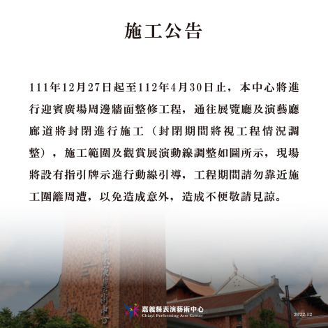 嘉義縣表演藝術中心迎賓廣場周邊牆面啟動整修工程,預計於112年4月30日完工,施工期間參觀動線進行調整,已公告於官網及粉絲專頁,並於園區內設置動線指引,造成不便敬請見諒。