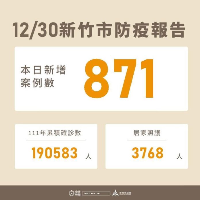 新竹市今(30)日新增871例確診個案,今(111)年以來累積190,583例,居家照護者為3,768人。