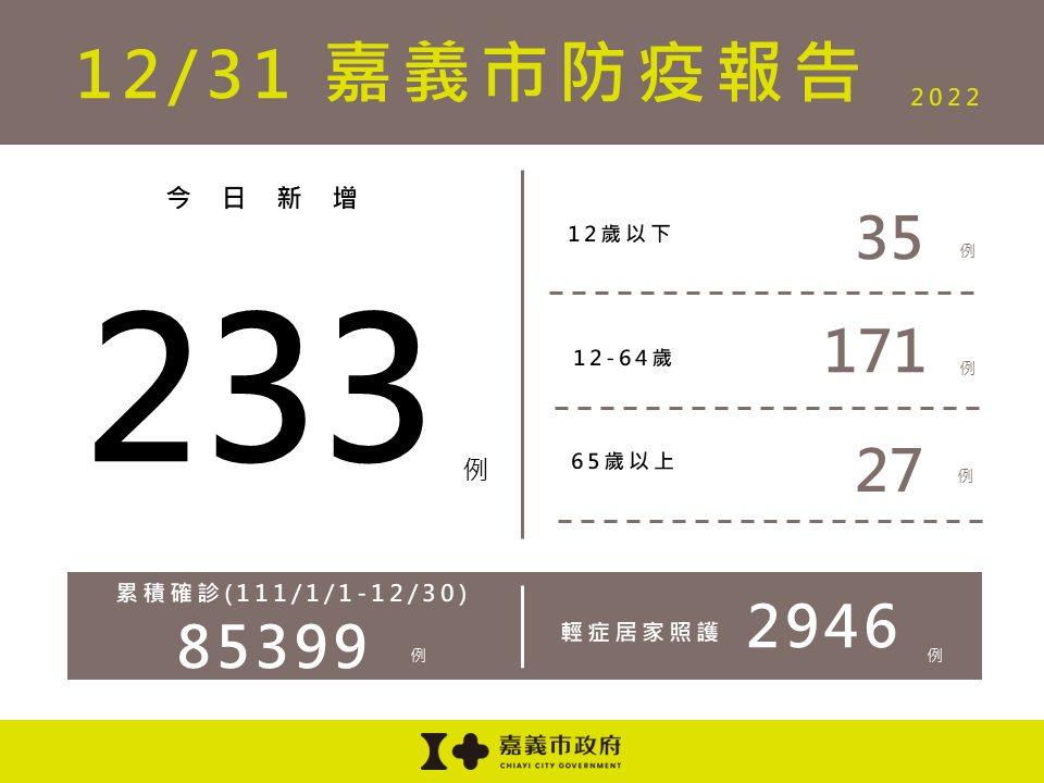 中央流行疫情指揮中心今(12/31)日公布嘉義市新增233例確診個案,包含12歲以下35例,12-64歲171例,65歲以上27例。嘉義市目前輕症居家照護人數2,946人。111/1/1截至111/12/30嘉義市累計確診嚴重特殊傳染性肺炎本土病例數為85,399人。 衛生局提醒,請大家儘速接種疫苗,並持續落實勤洗手、咳嗽禮節及佩戴口罩等防疫措施,避免出入人多擁擠的場所及高感染傳播風險場域,如出現疑似症狀,儘速快篩就醫和遵從醫囑及早服藥,降低重症及死亡風險;並請養成規律運動、均衡飲食、充足睡眠、壓力調適、不吸菸等健康習慣,提升免疫力,守護自己與家人的健康。