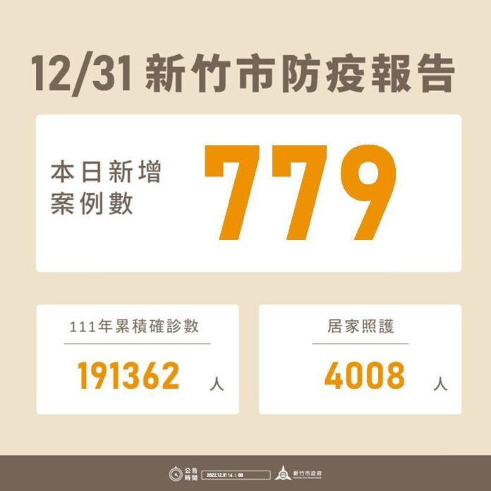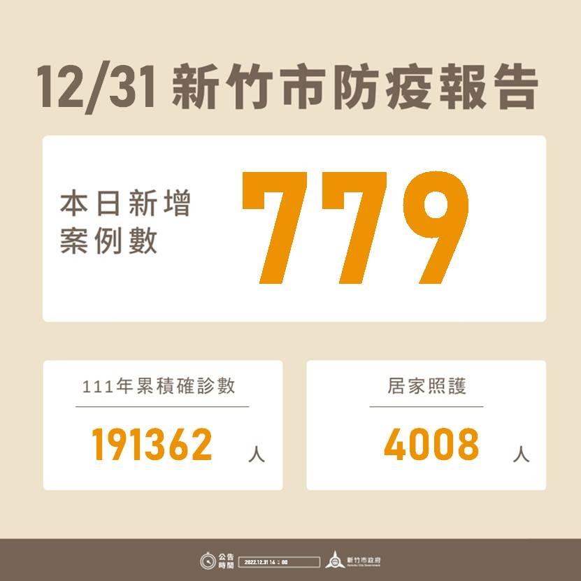 新竹市今(31)日新增779例確診個案,今(111)年以來累積191,362例,居家照護者為4,008人。