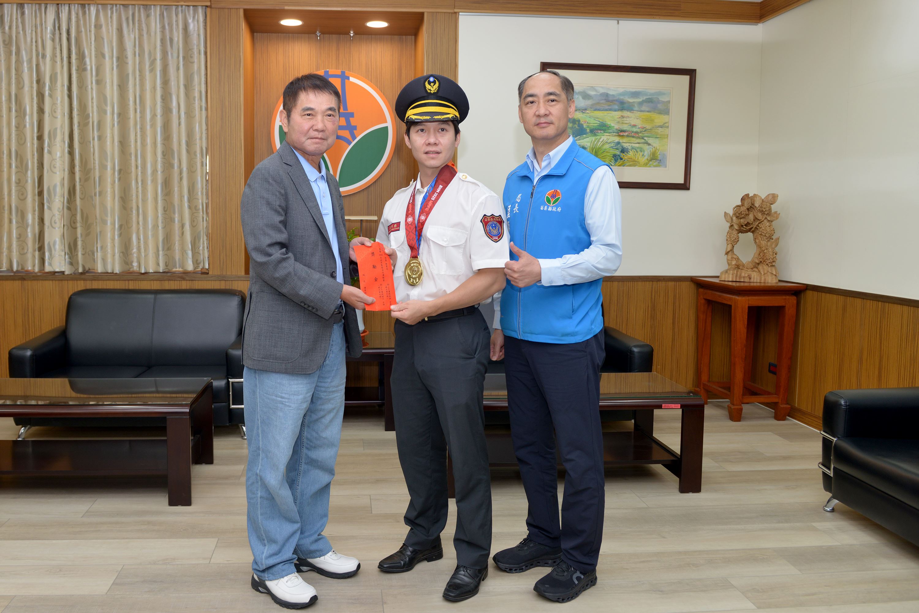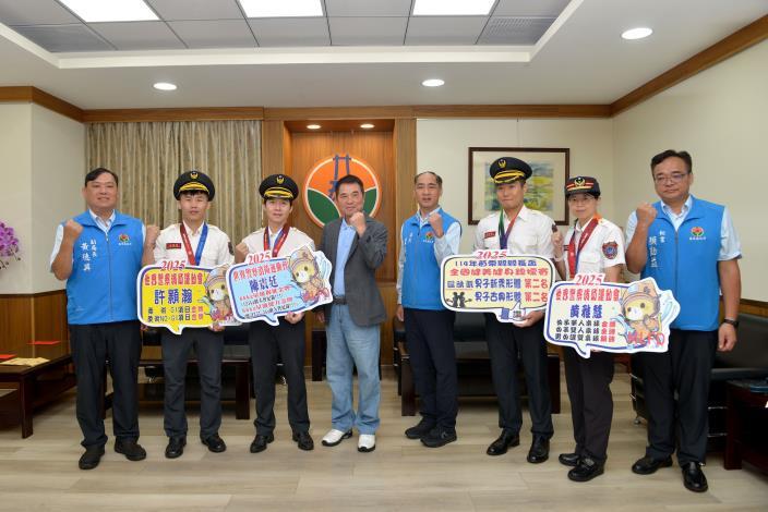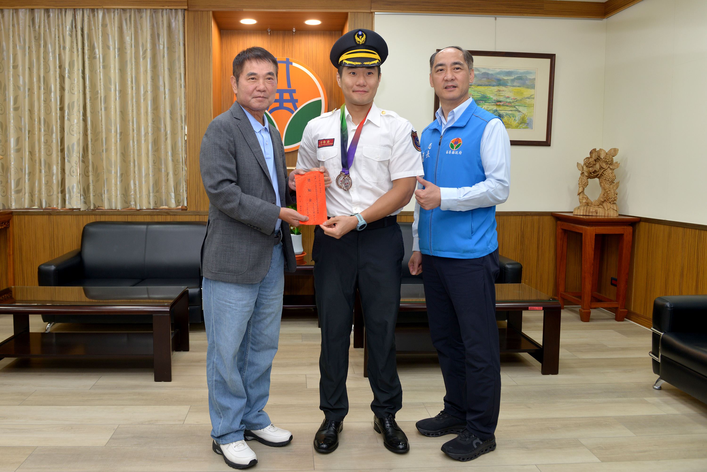 苗栗縣政府消防局隊員許顥瀚、陳震廷、黃雅慧參加「2025年第21屆世界警察消防運動會」獲6金1銀殊榮,另温欣凱參加「114年苗栗縣縣長盃全國健美健身錦標賽」亦獲得雙料銀牌佳績,縣長鍾東錦7月21日上午在縣府親自表揚獲獎人員,並讚許他們為自己和苗栗爭光,期待他們明年再接再厲、更上層樓。
