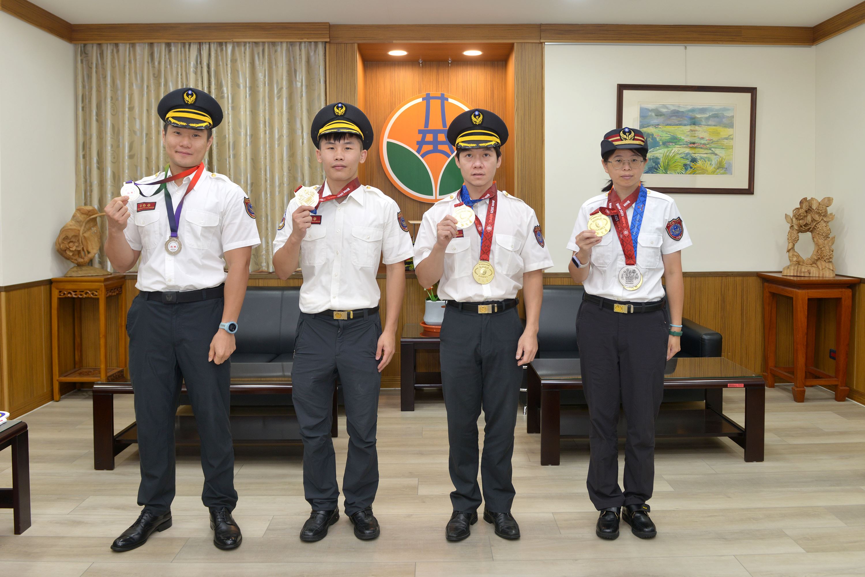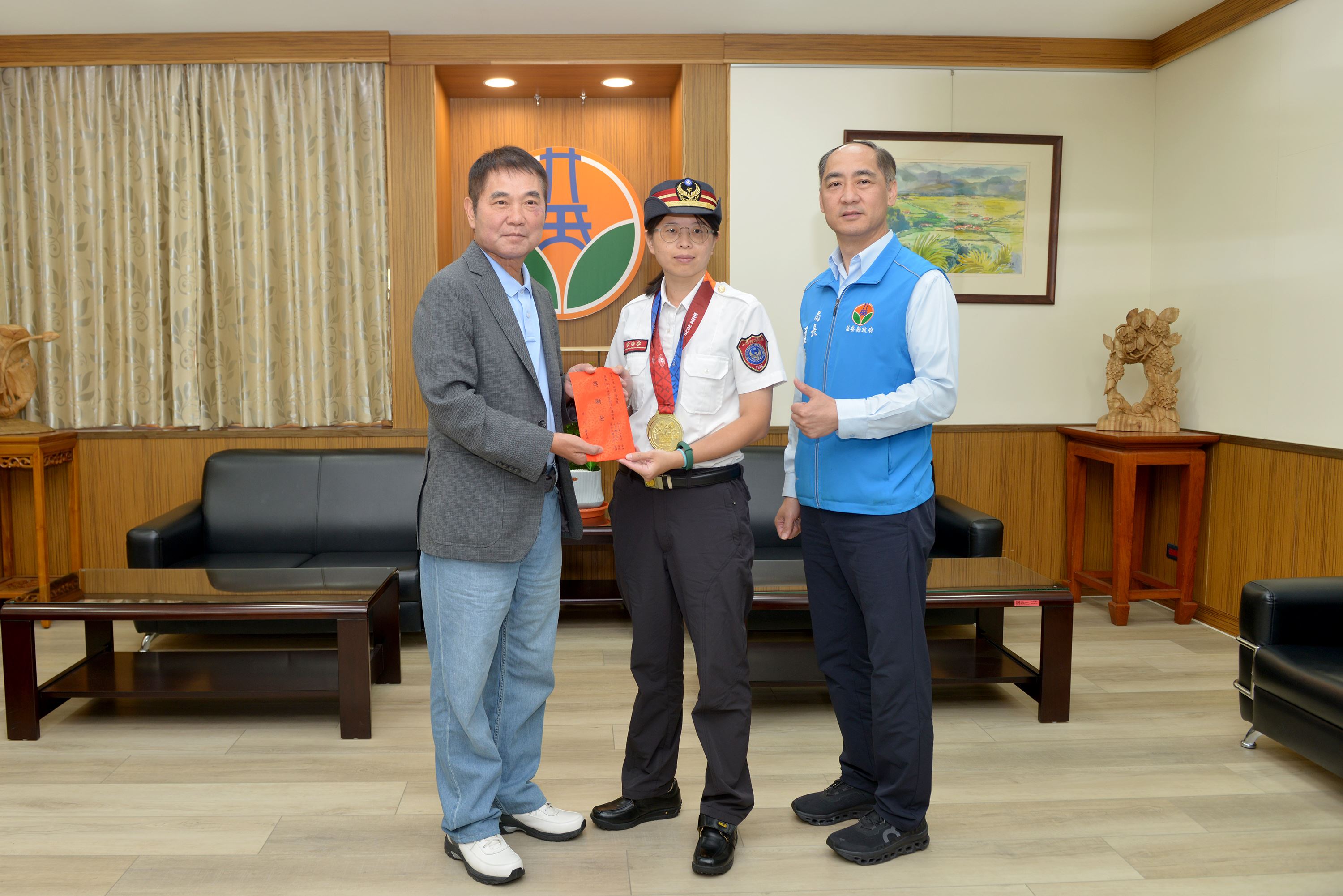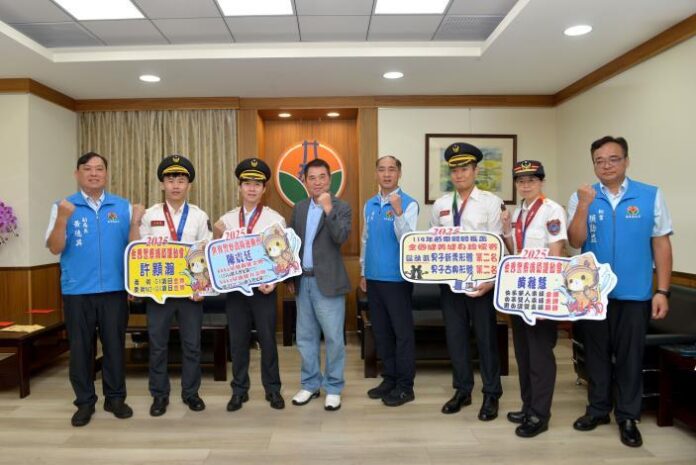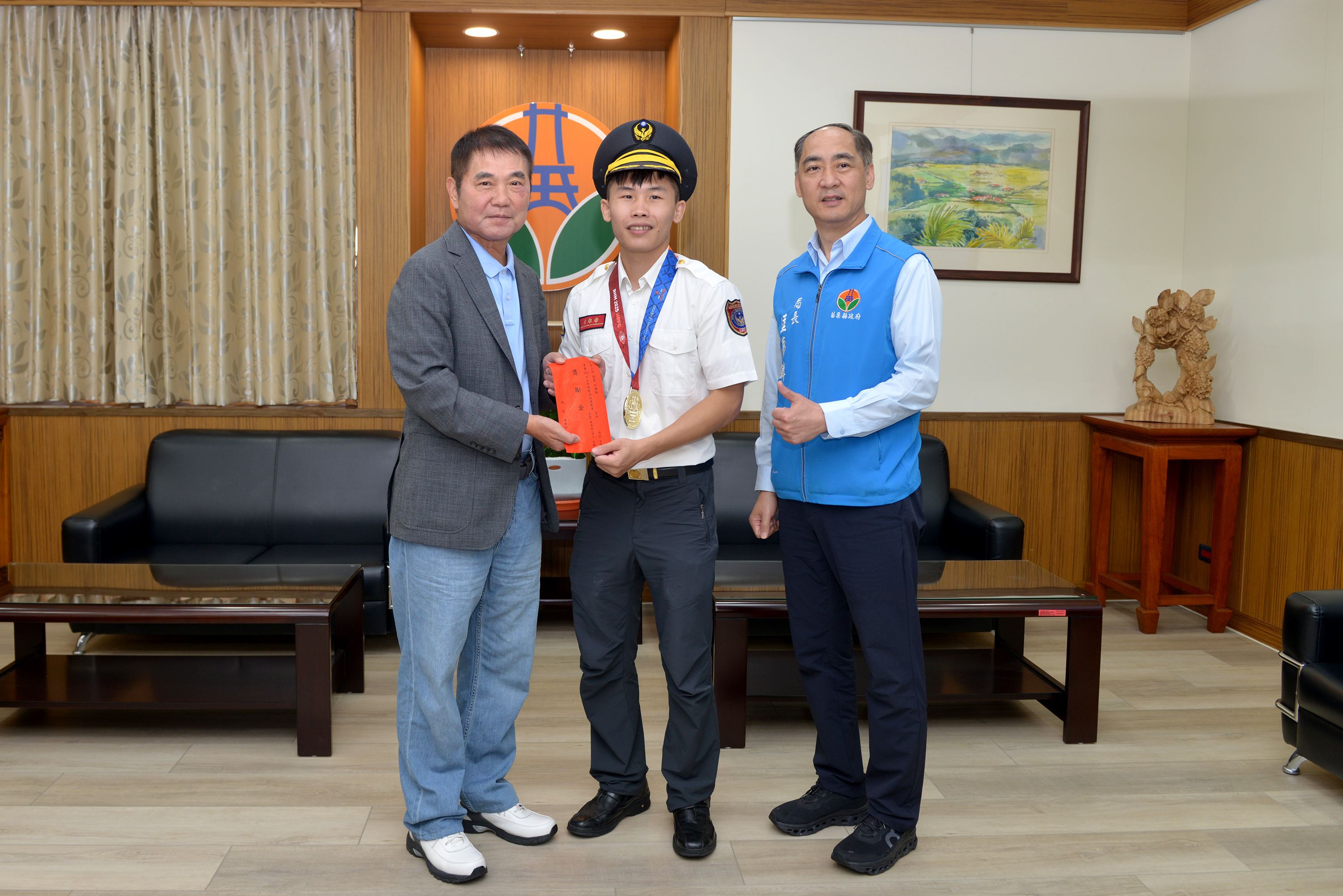 苗栗縣政府消防局隊員許顥瀚、陳震廷、黃雅慧參加「2025年第21屆世界警察消防運動會」獲6金1銀殊榮,另温欣凱參加「114年苗栗縣縣長盃全國健美健身錦標賽」亦獲得雙料銀牌佳績,縣長鍾東錦7月21日上午在縣府親自表揚獲獎人員,並讚許他們為自己和苗栗爭光,期待他們明年再接再厲、更上層樓。