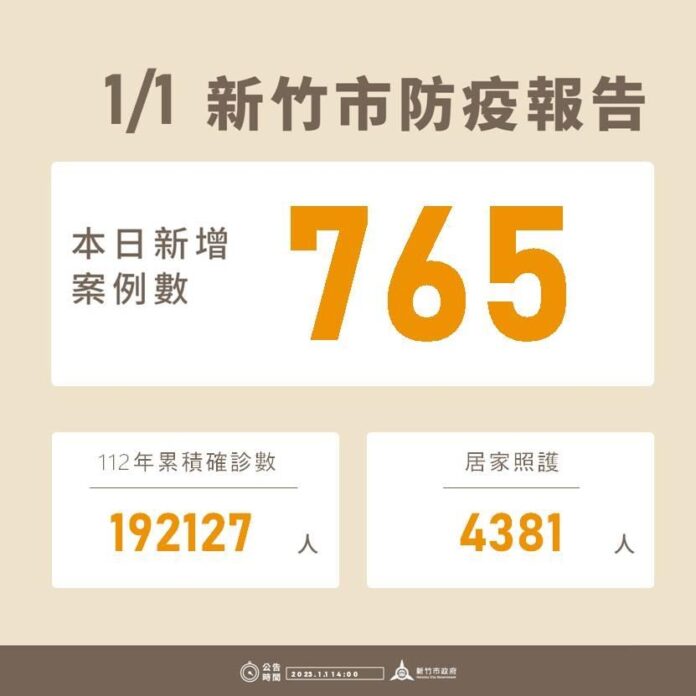 新竹市今(1)日新增765例確診個案,今(112)年以來累積192,127例,居家照護者為4,381人。