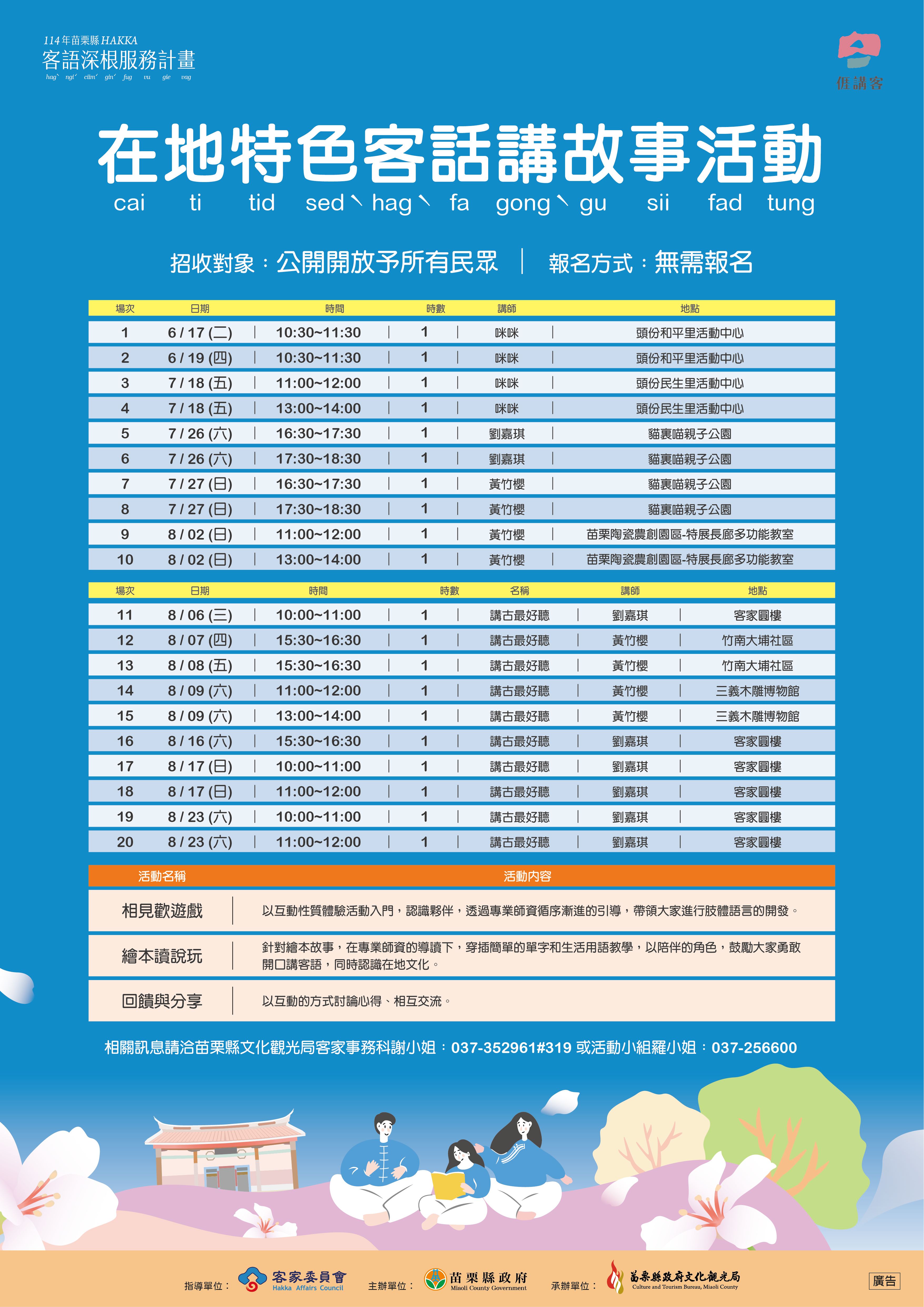 活動時間、地點請至苗栗縣政府文化觀光局官網https://www.mlc.gov.tw/活動快訊查詢,或電洽客家事務科謝小姐(037)352961#319或活動小組朱小姐(037)256600洽詢。