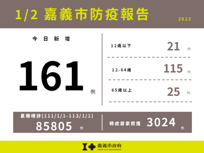中央流行疫情指揮中心今(1/2)日公布嘉義市新增161例確診個案,包含12歲以下21例,12-64歲115例,65歲以上25例。嘉義市目前輕症居家照護人數3,024人。111/1/1截至112/1/1嘉義市累計確診嚴重特殊傳染性肺炎本土病例數為85,805人。 衛生局提醒,請大家儘速接種疫苗,並持續落實勤洗手、咳嗽禮節及佩戴口罩等防疫措施,避免出入人多擁擠的場所及高感染傳播風險場域,如出現疑似症狀,儘速快篩就醫和遵從醫囑及早服藥,降低重症及死亡風險;並請養成規律運動、均衡飲食、充足睡眠、壓力調適、不吸菸等健康習慣,提升免疫力,守護自己與家人的健康。