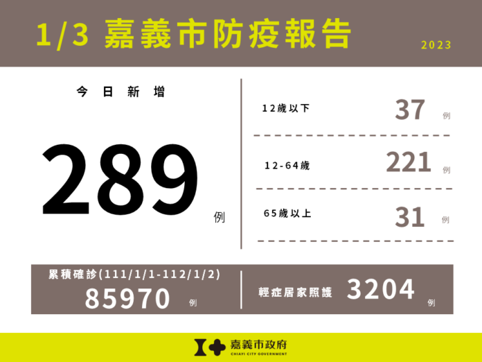 中央流行疫情指揮中心今(1/3)日公布嘉義市新增289例確診個案,包含12歲以下37例,12-64歲221例,65歲以上31例。嘉義市目前輕症居家照護人數3,204人。111/1/1截至112/1/2嘉義市累計確診嚴重特殊傳染性肺炎本土病例數為85,970人。 春節將至,本土COVID-19疫情升溫,為降低返鄉及旅遊人潮傳播風險,請大家盡快接種COVID-19疫苗,無論是否曾確診,符合間隔時間者均建議追加接種「BA.5次世代疫苗」,疫苗接種後約2週後開始產生保護力,嘉義市加碼自即日起符合接種的各年齡層民眾至「嘉義市COVID-19疫苗合約醫療院所」接種「任何一劑的COVID-19疫苗」,即可獲得精美浴巾1條,數量有限送完為止,相關接種訊息請至衛生局網站/主題專區/COVID-19疫苗接種資訊專區(https://health.chiayi.gov.tw/cp.aspx?n=7501)查詢。