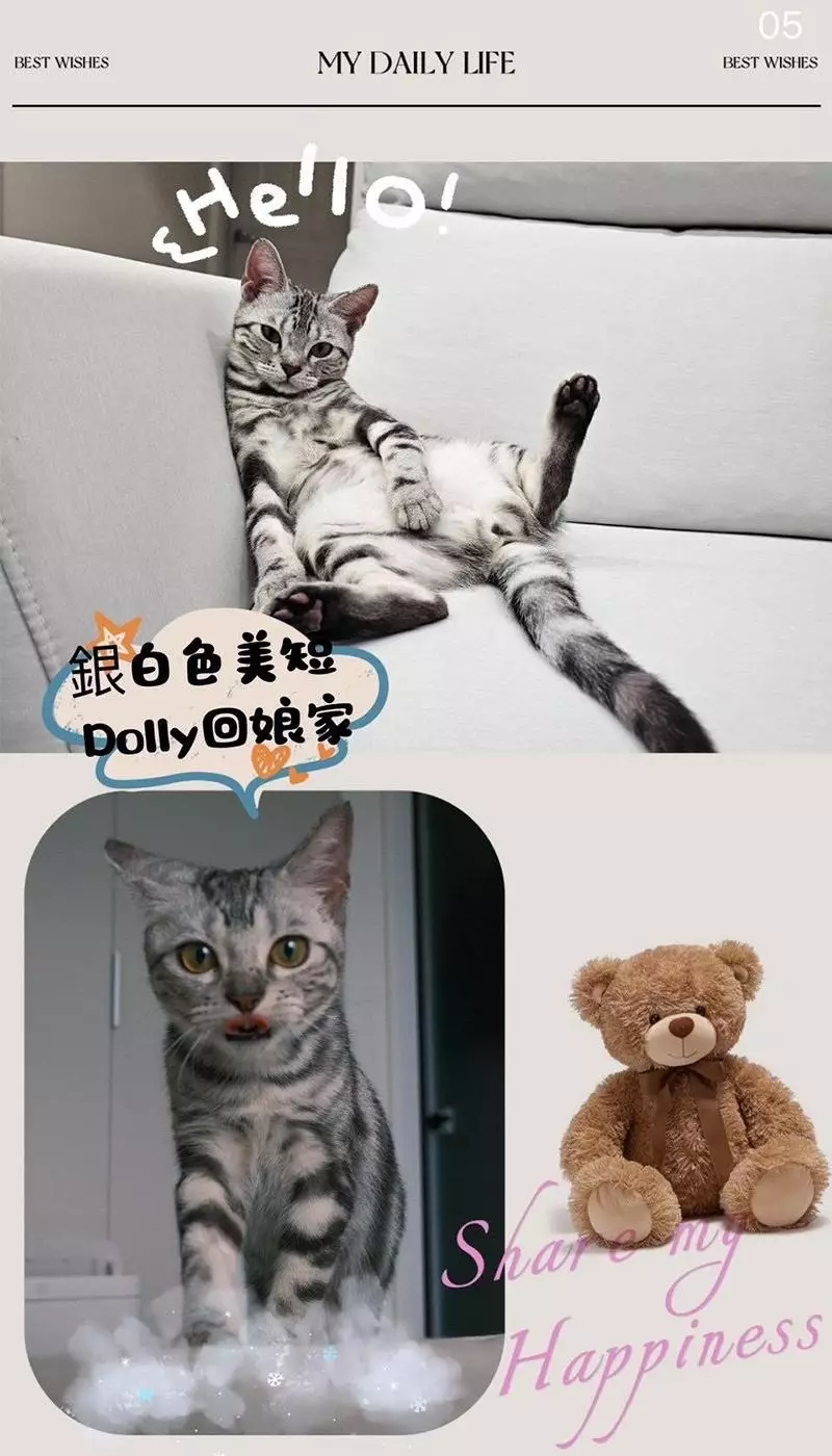 喵星人貓舍迎回深受大家喜愛的銀白美短「Dolly」回娘家。這隻曾經調皮耍賴、黏人愛撒嬌、睡姿豪氣十足的寶貝,一踏進熟悉的環境,馬上以慵懶又自在的姿態躺上沙發,像向大家宣告:「我回來囉~」。這一瞬間,所有工作人員心頭都被溫暖與感動填滿。