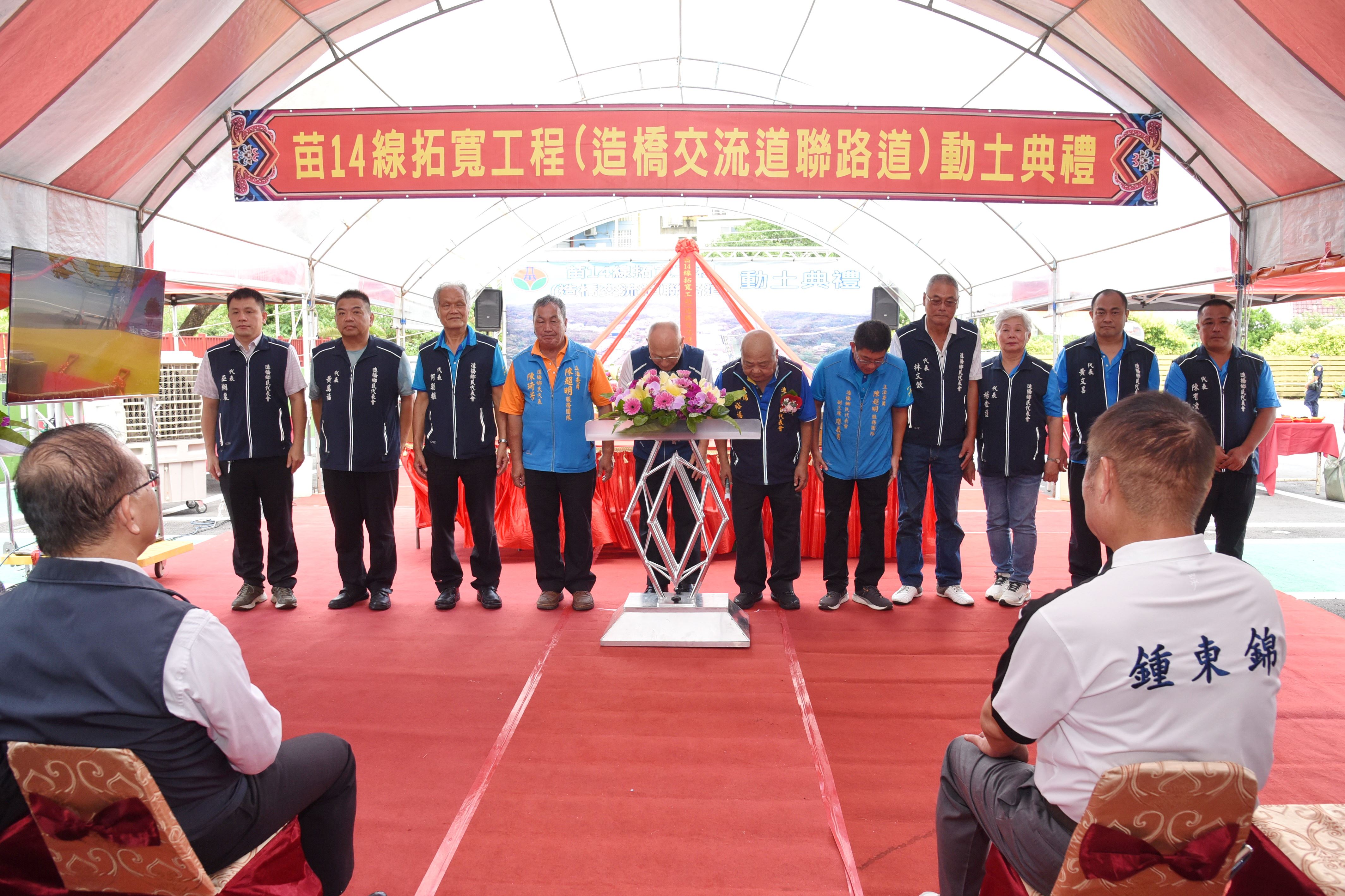 苗14線拓寬工程動土被視為地方一大喜事,縣長鍾東錦邀請交通部政務次長陳彥伯、副司長廖振遠、公路局副總工程司李順成、高公局分局長張勝瑋,還有立委陳超明、選區縣議員、鄉長徐連斌及代表多人,一起焚香祝禱後持鏟動土,象徵地方期盼多年的造橋交流道工程,扎實地向前邁進一大步。
