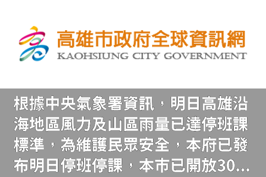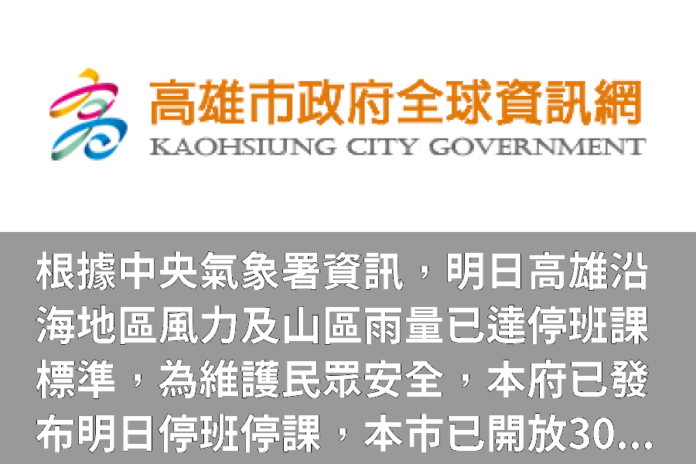 根據中央氣象署資訊,明日高雄沿海地區風力及山區雨量已達停班課標準,為維護民眾安全,本府已發布明日停班停課,本市已開放305處臨時停車處所,供市民緊急停放車輛。