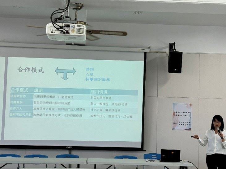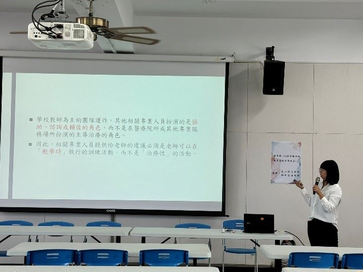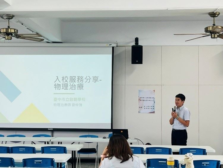 此次研習特別邀請到本縣特殊教育相關專業團隊王心婷職能治療師、台中市立啟聰學校劉仲強物理治療師分享專業團隊入校及在家教育服務經驗,並從自身專業的角度提供普特教師教學策略,如:視覺提示融入教育目標、情境練習來幫助學生提升生活自我照顧能力,或是針對小巧思的改造,來提升學生參與學習、團體活動之能力,並且透過跨專業合作模式與校內普特老師交流,共同討論出合適學生的學習模式,以利提升學習效能。