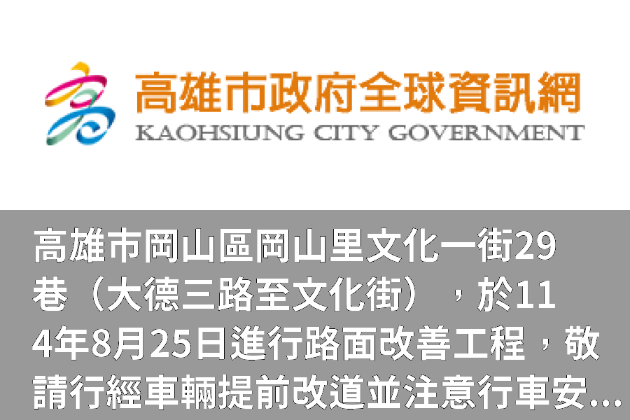 為改善高雄市道路通行品質,工務局道路養護工程處將於8月25日進行岡山區岡山里文化一街29巷(大德三路至文化街)路面改善。施工時段為上午8時至晚間8時,另為顧及工程品質,刨鋪後均依施工規範封閉養護6小時以上或溫度降低至50°C以下始開放通車,確保道路使用壽命及品質,如遇天候不佳,將順延1天至3天進場施工。