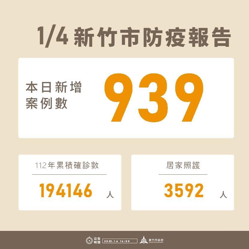 新竹市今(4)日新增939例確診個案,今(112)年以來累積194,146例,居家照護者為3,592人。