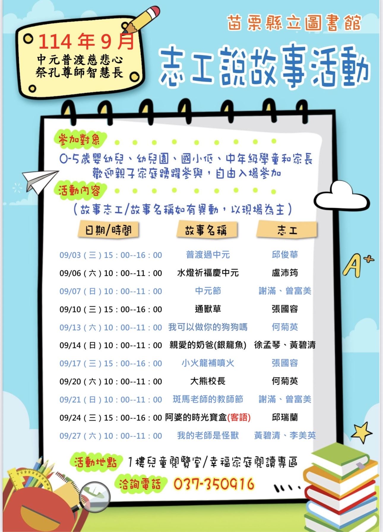 有關9月志工說故事活動的詳細時間與場次,請參見海報或洽詢苗栗縣立圖書館,電話:037-350916(徐小姐),更多活動資訊也可參閱苗栗縣政府網站(https://www.miaoli.gov.tw/)及苗栗縣立圖書館網站(https://lib.miaoli.gov.tw/)。