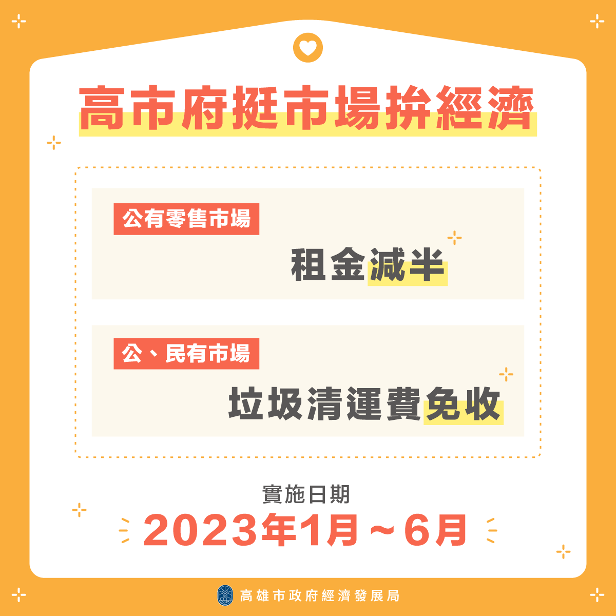 有鑑於新冠疫情衝擊民生經濟,高雄市政府經發局自109年起主動減半收取公有市場租金,與攤商共度疫情難關迄今,目前疫情雖已逐步趨緩,但為持續協助攤商疫後復甦,經發局昨(3)宣布公有市場租金減半,且公、民有市場垃圾清運費全面免收,實施時間回溯自今(112)1月1日起至今年6月30日,盼能紓解攤商經營壓力,並將持續編列及爭取經費協助市場軟硬體優化,力挺市場攤商疫後拚經濟。