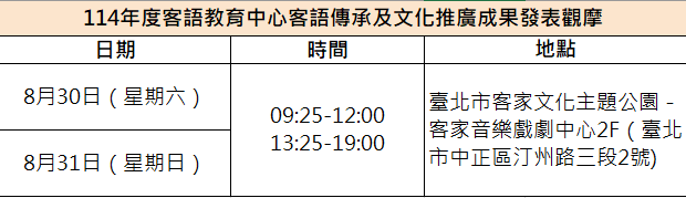 今年成果發表除了在臺北市客家文化主題公園演出,連續兩年成果發表進入決賽獲勝的優秀「示範班隊」,將安排在11月29日下午2時至4時於「2025士林官邸菊展」活動中演出,邀請市民朋友一同來欣賞精采的客家藝文表演。