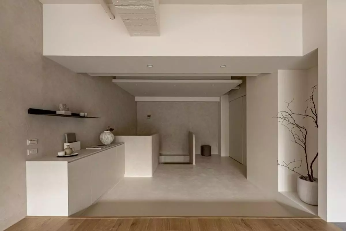 案名「映白之光」為新屋住宅,居住成員為二大一小,空間格局二房二廳二衛。設計以現代簡約為基調,融合自然質感與細膩工藝,整體以大面積純白作為主色調,營造潔淨通透的空間感受。白色牆面與天花板構成純粹背景,突顯選材層次與細節,搭配溫潤實木皮飾面與質感陶板磚巧妙結合。鐵件與鏡面點綴其中,低調中展現俐落現代感,形成剛柔並濟的設計語彙。入室可見獨立玄關區,地坪採仿石材質感地磚,與室內淺色木地板自然過渡,搭配大面積鏡面與懸空鞋櫃,兼具視覺開闊與收納功能,為空間定下優雅現代氣息的開場。