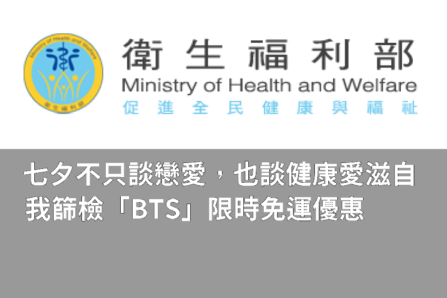 疾病管制署(下稱疾管署)今(27)日表示,今(2025)年七夕情人節適逢暑假的尾聲,疾管署為鼓勵年輕族群定期接受愛滋篩檢,推出愛滋自我篩檢專屬的優惠碼「BTS」(Back To School)限時免運費優惠,自今年8月29日凌晨零時起至9月7日午夜23時59分止,於疾管署「自我篩檢計畫官網」 ( https://hiva.cdc.gov.tw/Selftest/),點選「網路訂購超商取貨」通路,購買愛滋自我篩檢試劑,輸入專屬優惠碼「BTS」即可享免45元物流費,一起在新學期開始前了解自身健康狀態,開啟浪漫新生活。