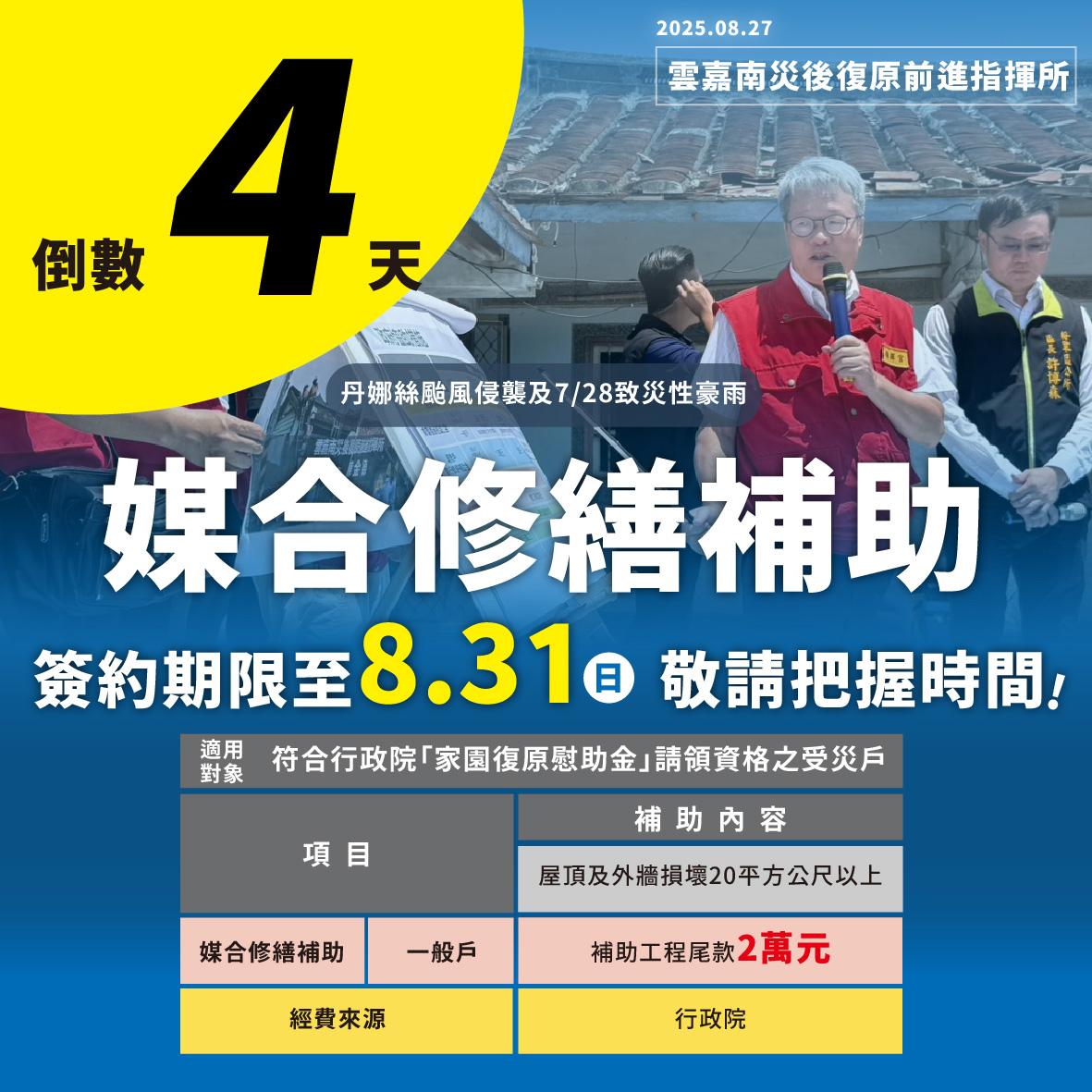 雲嘉南災後復原前進指揮所今(27)日提醒,行政院提供的媒合修繕簽約補助申請期限,將於114年8月31日截止,再次呼籲尚未簽約的災民盡速申請,前進指揮所也在昨(26)日工作會議,請各區、鄉、鎮、市公所與技術團隊持續強化媒合進度,協助符合資格之民眾盡快安心完成簽約程序,把握政府提供的實質協助。前進指揮所指出,此項補助針對屋頂或外牆損壞達20平方公尺以上之受災戶,只要符合「家園復原慰助金」請領資格,即可申請簽約獎勵補助,行政院將補助每戶工程尾款2萬元,幫助受災家庭降低修繕負擔、加快家園重建步伐。各公所與技術團隊除加緊進行戶對戶媒合外,也已主動連繫尚在考慮報價之住戶,協助其釐清修繕流程與報價內容,讓民眾能夠安心做決定,不錯過補助時程。前進指揮所強調,目前修繕作業進入關鍵加速期,政府與民間團體持續投入資源與人力,再次呼籲尚未簽約的災民盡速申請,把握114年8月31日前的黃金期,早日重建家園。