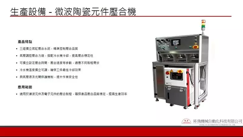 微波陶瓷元件壓合機:適用於微波元件及電子元件的壓合製程,確保產品壓合品質穩定,提高生產效率。