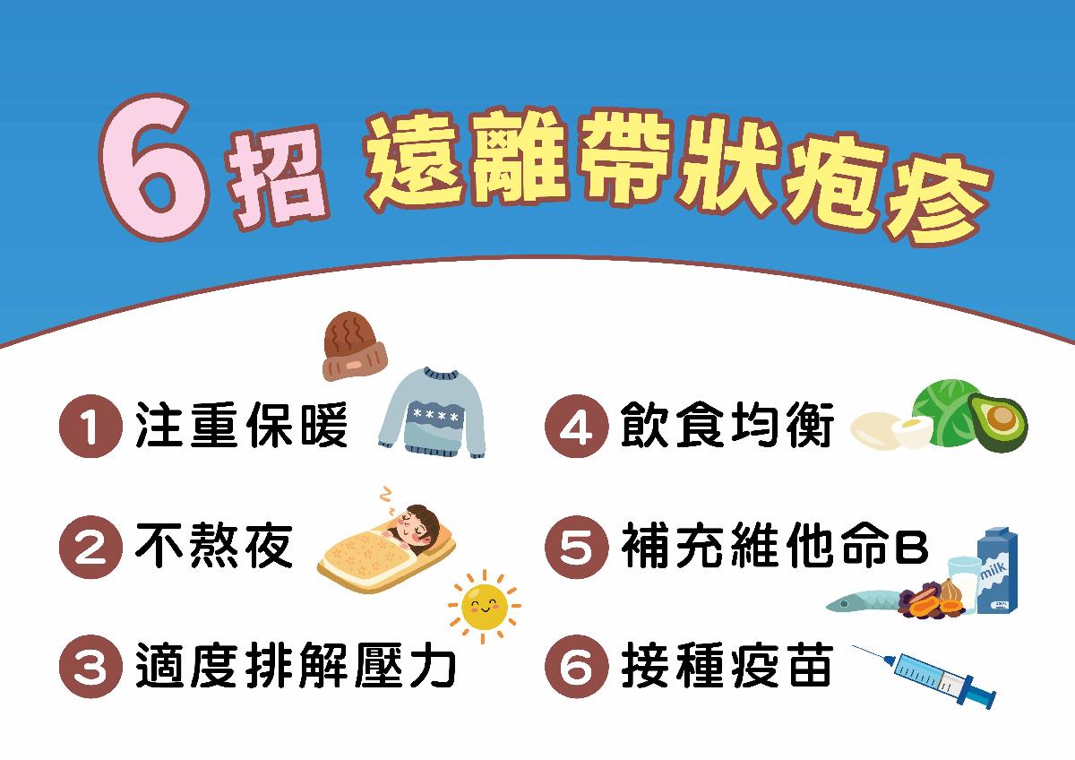 北市衛生局表示,保持規律的作息、避免熬夜、儘量降低生活與工作的壓力、均衡飲食、接種疫苗等提升自身免疫力,可降低帶狀疱疹及其併發症的發生。