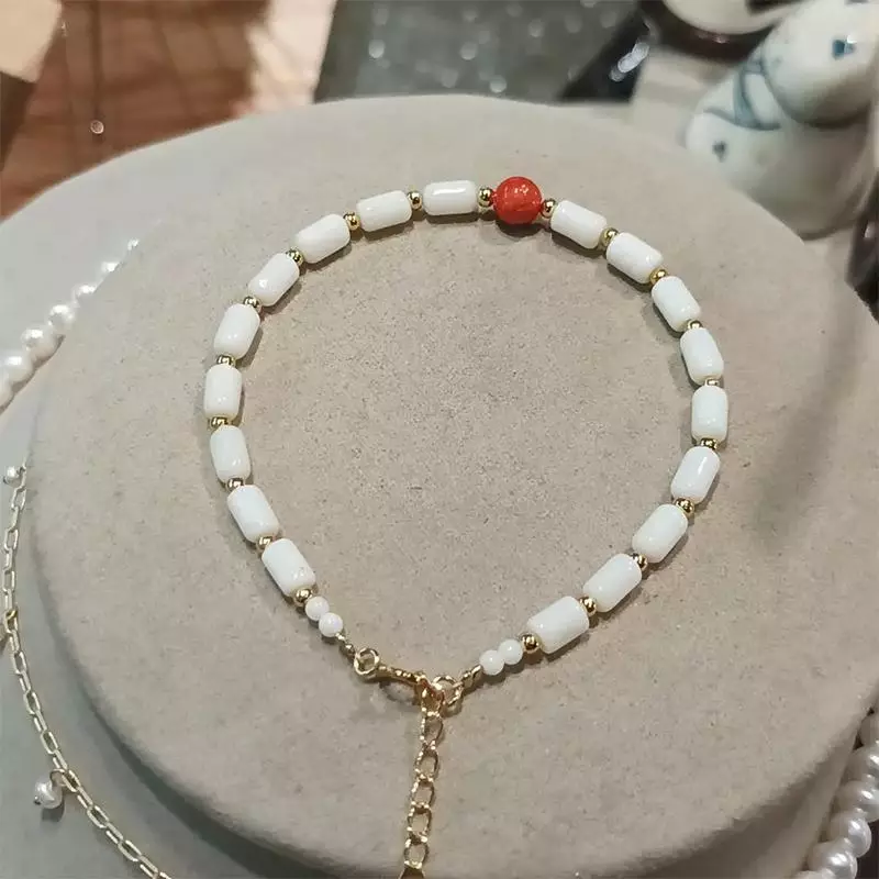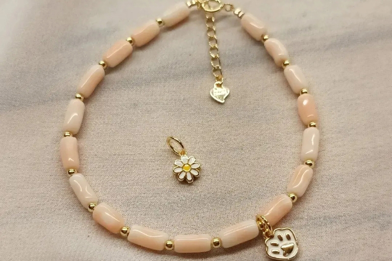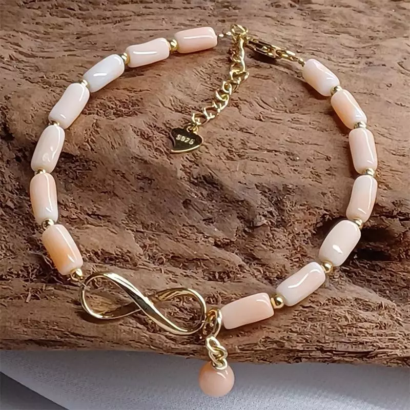 店內一款「8字型純銀鍍金無限符號」設計,其實早已靜靜躺在材料盒中多時。奶奶笑說,靈感總是需要「天時地利人和」,這次正好因小小的巧合而誕生新的搭配——在無限符號旁加上一顆粉珊瑚小球,讓原本低調的作品增添一抹活潑氣息。
