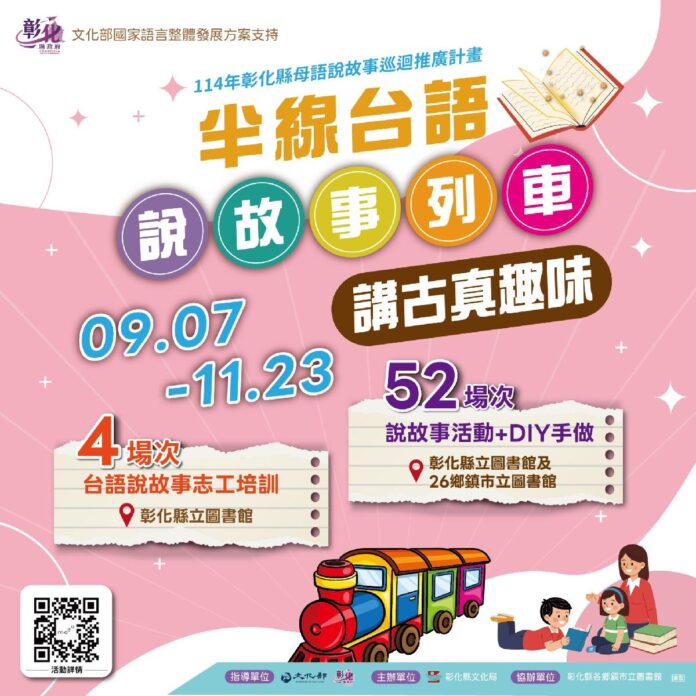 講古真趣味!不只是教語言,更是傳遞文化與情感。透過故事與手作,讓孩子自然習得母語並在日常生活中運用。活動全程免費,邀請大小朋友巡迴全縣,聽故事、學台語、享手作。詳細場次與報名方式,請至彰化縣文化局網站查詢(https://gov.tw/12h),期望藉由「半線台語說故事列車」,讓母語在生活中自然扎根,成為傳承的學習力量。