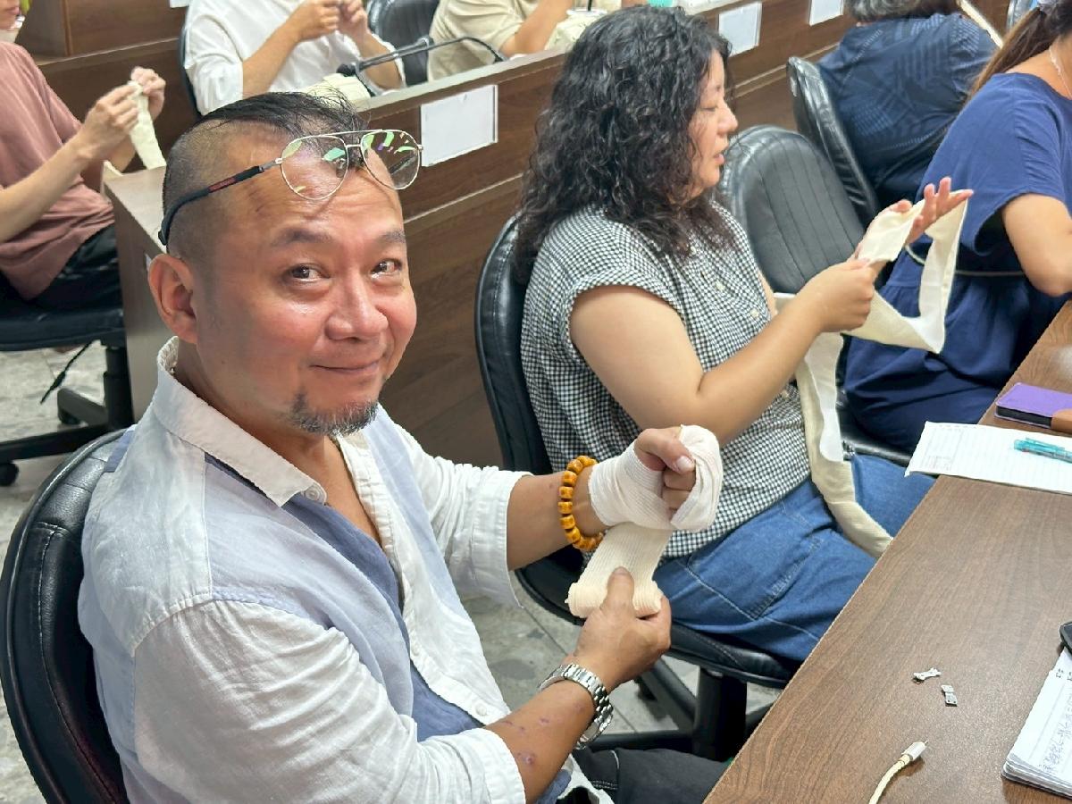 在技能實作部分,救護教官曾慶祥與助教周佳慧指導學員演練CPR、AED與包紮技巧,強調「及時、正確的急救能救人一命!」。消防局科長陳進源分享地震防護技巧,著重在「在面對未知的災害時要做到更好的準備!」。