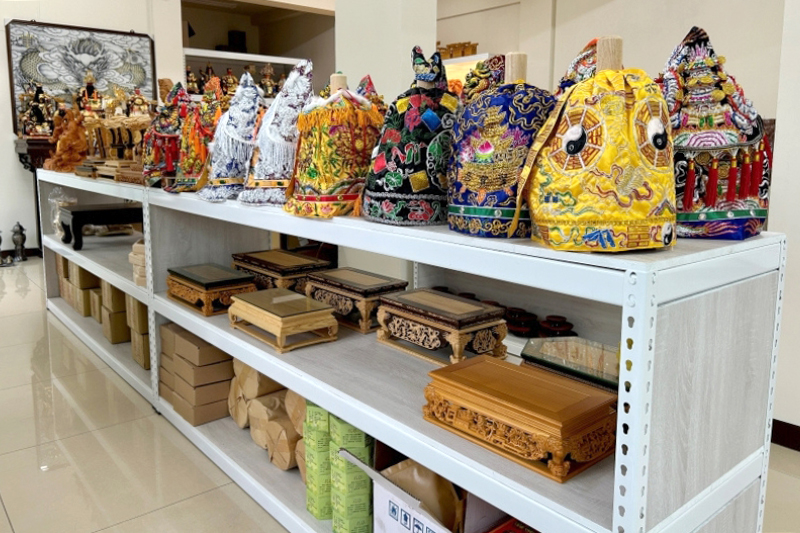 店內陳列多種由老闆與老闆娘親自挑選的佛具商品,包括神像雕刻、神桌、神龕、龍椅、神明帽冠、銅器與手工神衣等,風格融合莊嚴與美感,材質堅固精緻。無論是家庭佛堂布置,還是廟宇神尊安座,都能在這裡找到合適的器物。