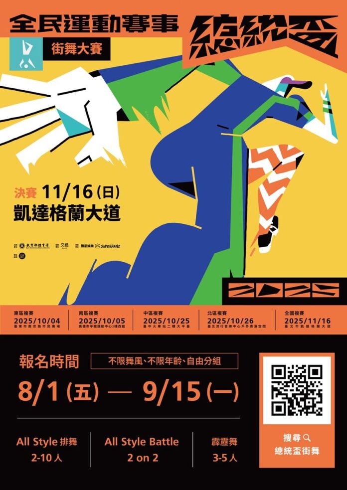 由教育部體育署主辦「2025總統盃全民運動賽事-街舞大賽」自開放報名以來,受到全台各地舞蹈愛好者踴躍響應。為讓更多隊伍能參與這場全民盛事,主辦單位特別宣布報名期限延長至9月15日,邀請全國民眾一同展現舞力與活力,共同爭取總獎金新臺幣534萬元。