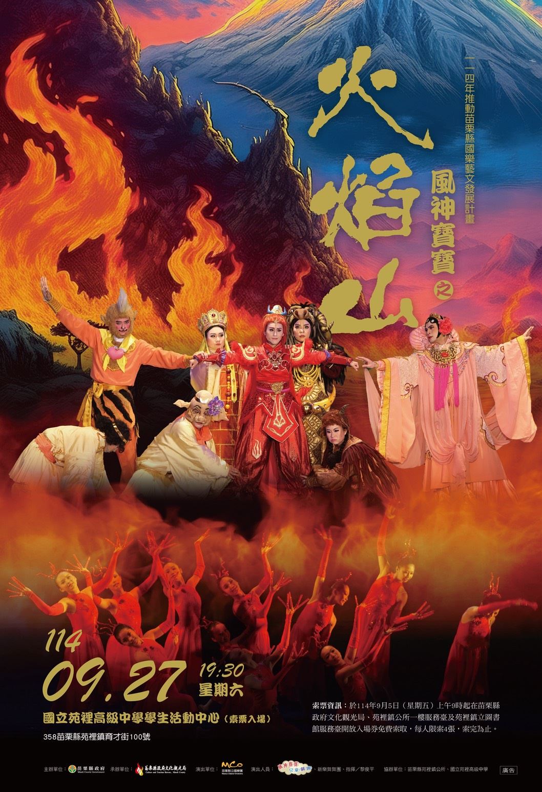 這場融合國樂、歌仔戲與舞台劇的親子劇場,由苗栗縣立國樂團攜手 風神寶寶兒童劇團及新樂舞舞團共同打造,改編自耳熟能詳的《西遊記》,將火燄山故事轉化為歡樂逗趣的現代表演,帶領觀眾走進一場充滿想像力的音樂冒險。《風神寶寶之火燄山》透過歌仔戲語彙、舞蹈動作及傳統戲劇元素,描繪出親情、勇氣與團隊合作的主題,演出中更融合教育議題,引導孩子思考生活與文化的連結,是一場寓教於樂、老少咸宜的奇幻親子劇場。