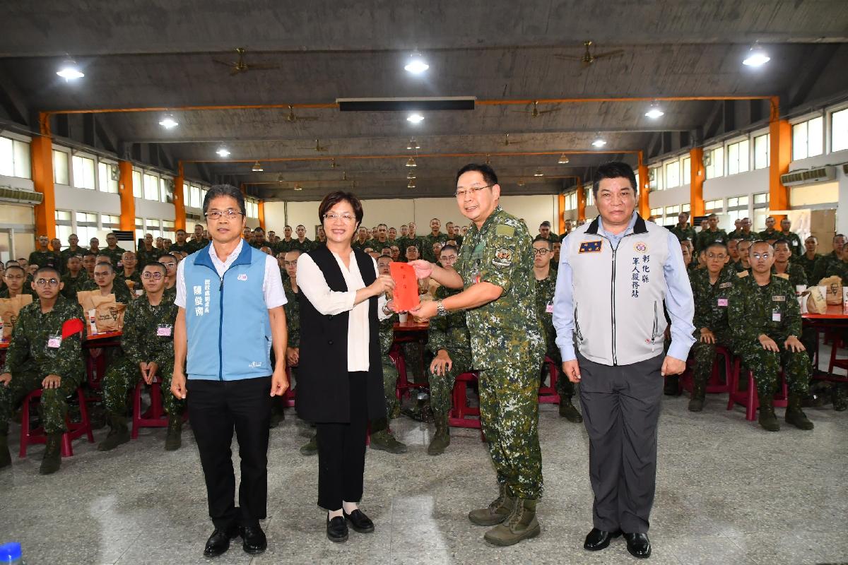 彰化縣長王惠美關心彰化子弟兵,今(8)日下午由縣府民政處副處長陳俊南、彰化軍人服務站長魏治民等人陪同,前往台南官田營區探視陸軍第239梯次軍事訓練役之縣籍子弟兵,受到營區長官及受訓役男熱烈歡迎。王縣長現場致贈加菜金及每人一份速食餐點,並以縣長媽媽的口吻叮囑役男把握服役期間鍛鍊身心、立定志向,同時保重身體。期許快樂當兵,平安退伍。