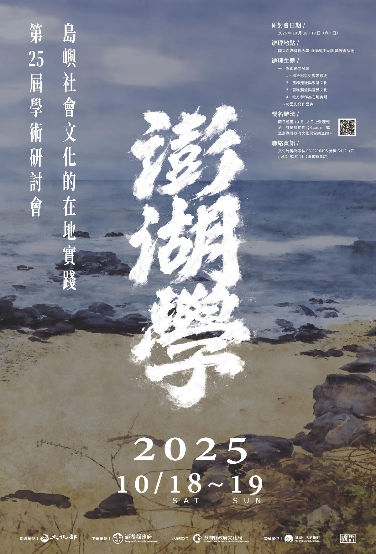 從2001-2020年的「澎湖研究」,發展至2021-2024的「澎湖學」,屬於澎湖人的地方研究學問,近年著重於學術制度之落實,並在議程規劃上求新、求變、求進步,竭力建構更加系統性、全面性的研究成果。澎湖學作為臺灣學的一支,研究豐碩且具有特色,至今仍有方興未艾之勢。為求於此一態勢下再度開拓格局,2025年(本屆)的「澎湖學」將以「島嶼社會文化的在地實踐」為主題,聚焦於以鄉、村為地理範圍的支學,開啟人人都有表述地方集體記憶與共同歷史的機會,為自己發聲、為地方書寫,保留相對豐富的史料,鞏固澎湖學的基礎工作。