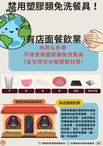 環境部自民國91年7月起,即公告規範 8 大類管制對象(含公部門、私立學校、百貨及購物中心、量販店、超級市場、連鎖便利商店、連鎖速食店及有店面餐飲業)不得提供塑膠類免洗餐具(含生物可分解塑膠),其中「有店面餐飲業」係指於建築物內或延伸至騎樓、人行道等空間營業,並提供座位供顧客現場食用者,不論內用或外帶,均不得提供塑膠類杯、碗、盤、碟、餐盒及餐盒內盛裝食物之內盤。