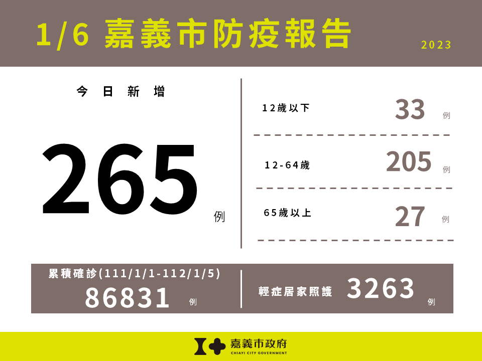 中央流行疫情指揮中心今(1/6)日公布嘉義市新增265例確診個案,包含12歲以下33例,12-64歲205例,65歲以上27例。嘉義市目前輕症居家照護人數3,263人。111/1/1截至112/1/5嘉義市累計確診嚴重特殊傳染性肺炎本土病例數為86,831人 衛生局提醒,請大家儘速接種疫苗,並持續落實勤洗手、咳嗽禮節及佩戴口罩等防疫措施,避免出入人多擁擠的場所及高感染傳播風險場域,如出現疑似症狀,儘速快篩就醫和遵從醫囑及早服藥,降低重症及死亡風險;並請養成規律運動、均衡飲食、充足睡眠、壓力調適、不吸菸等健康習慣,提升免疫力,守護自己與家人的健康。