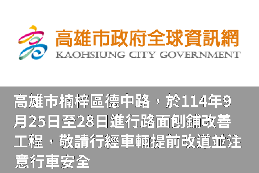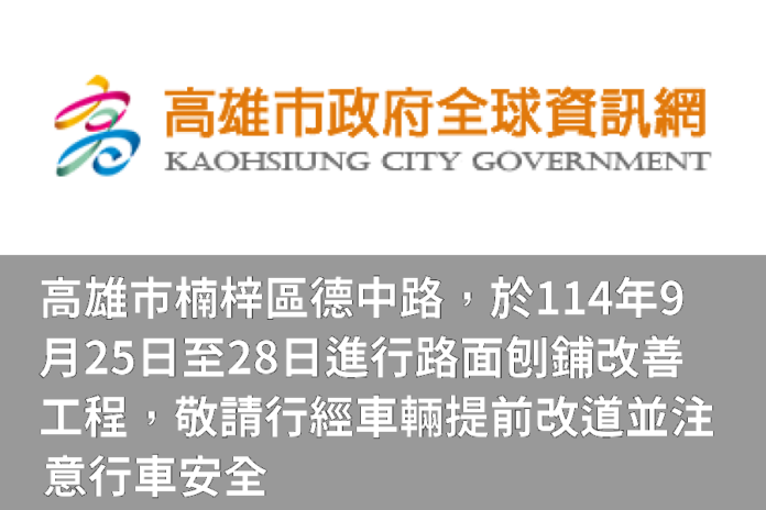 高雄市楠梓區德中路,於114年9月25日至28日進行路面刨鋪改善工程,敬請行經車輛提前改道並注意行車安全