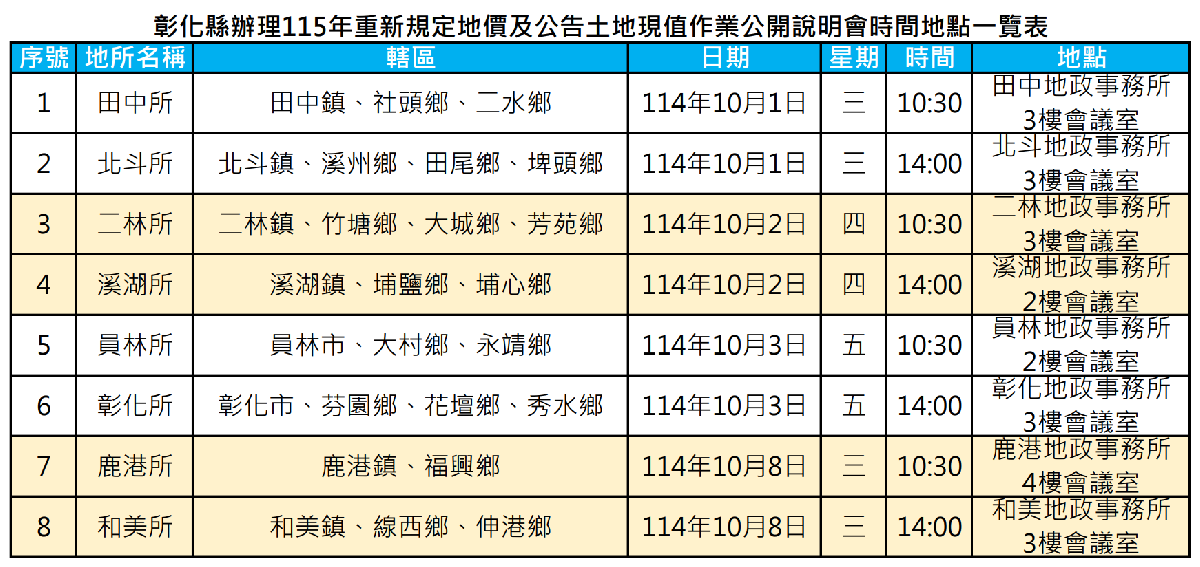 彰化縣115年公告土地現值及公告地價將於115年1月1日公告,為讓各界了解地價調整作業之辦理情形,廣泛蒐集民眾意見,本府將自114年10月1日起至114年10月8日止,分別於本縣8個地政事務所召開「115年重新規定地價及公告土地現值作業公開說明會」。