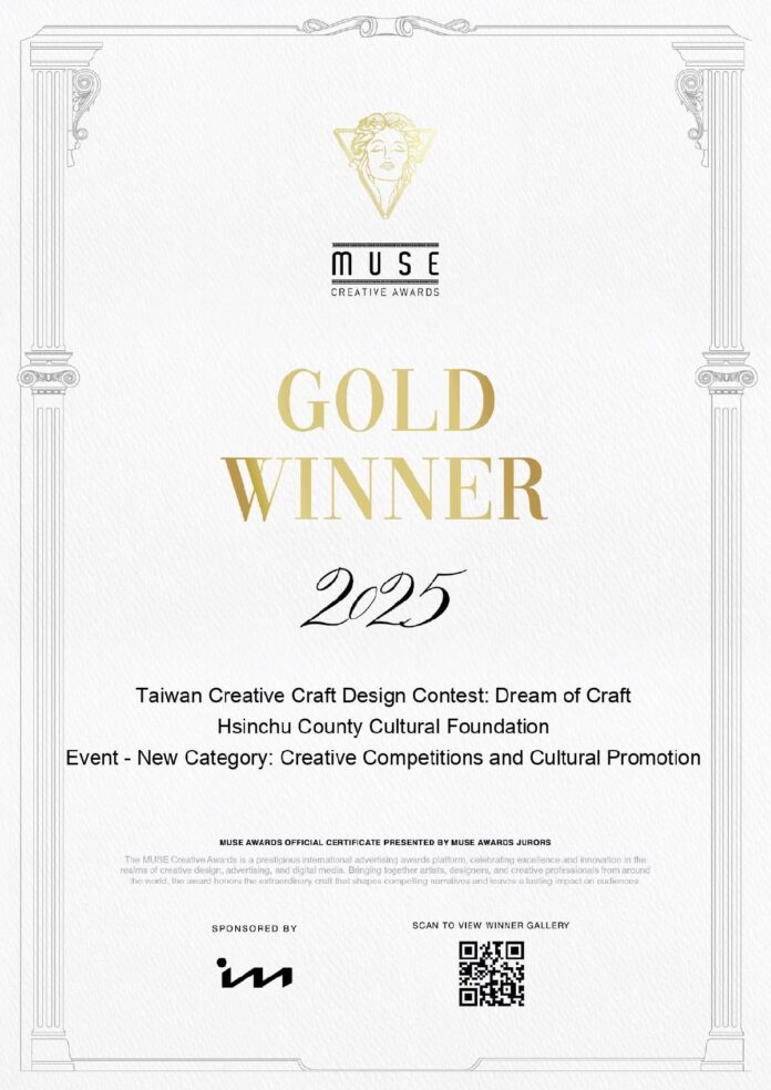 由財團法人新竹縣文化基金會主辦的「匠心之夢-全國文創工藝競賽」今年8月榮獲2025法國設計獎全球唯一金獎肯定,而近日參加2025年美國 MUSE Creative Awards 繆思創意設計獎(Season 2),從全球逾13,000件參賽作品中脫穎而出,再次榮獲金獎殊榮,此殊榮象徵新竹縣在文化藝術與文創工藝推動上的跨國能見度與實力日益提升,更充分展現地方文化創意與工藝設計的無限能量。